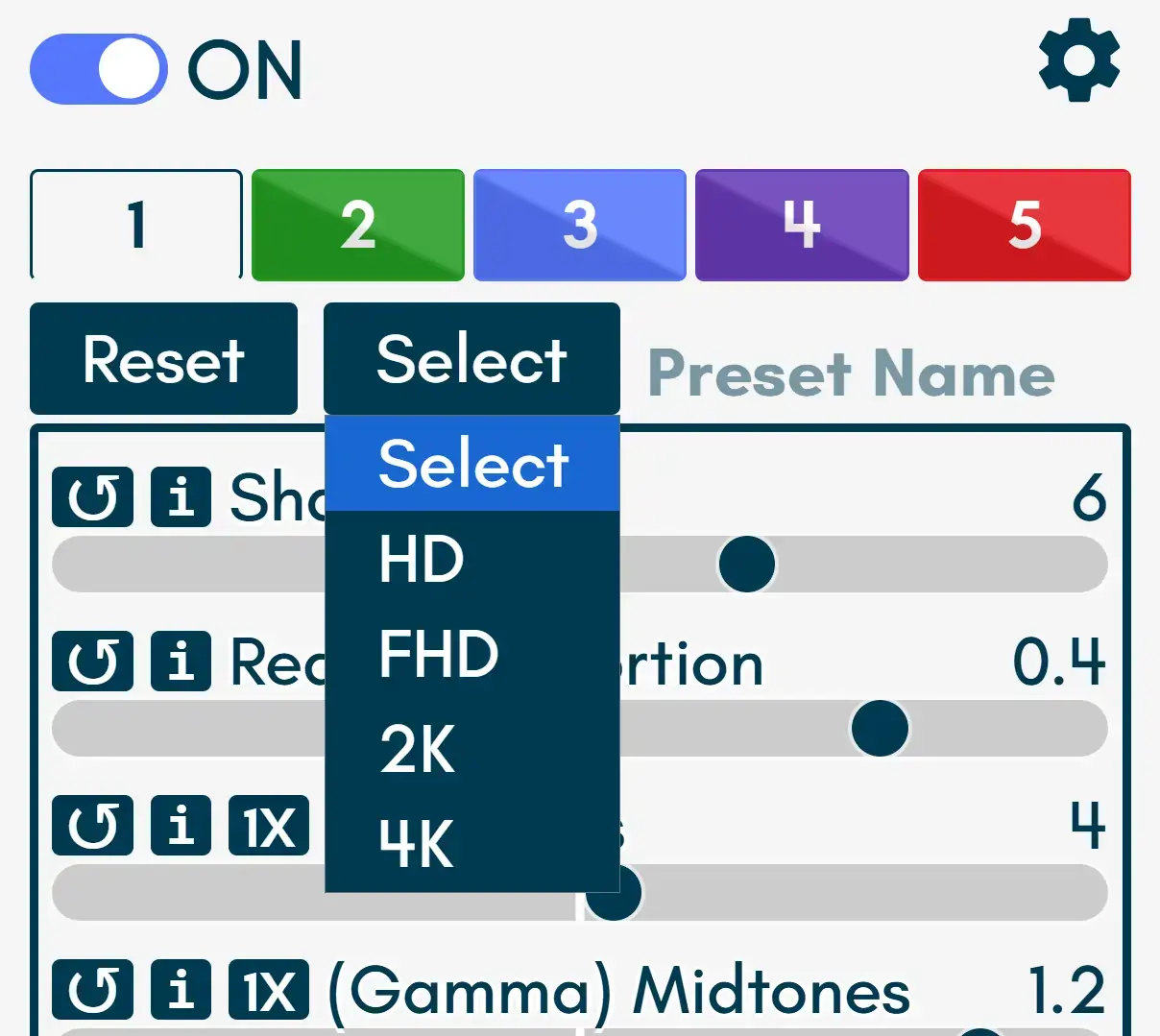Get an incredible picture instantly with One-Click Recommended Presets, expertly tuned to simulate an HD, FHD, 2K, and 4K video. For those who like to tweak, you can also save your own custom settings into 5 personal preset slots.